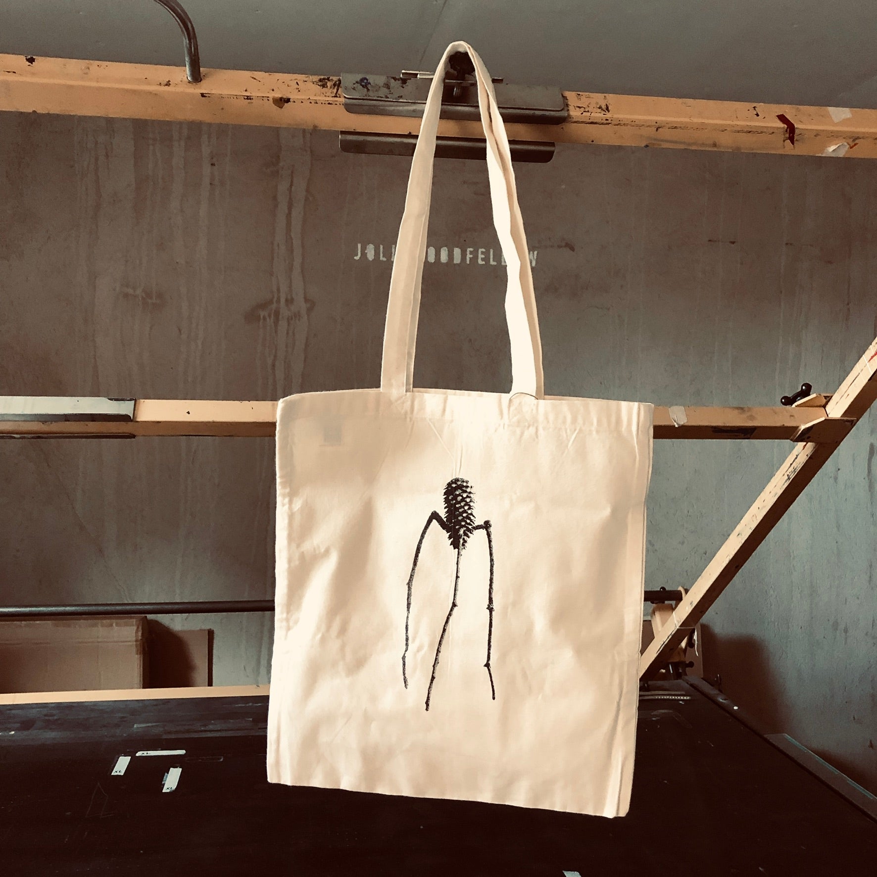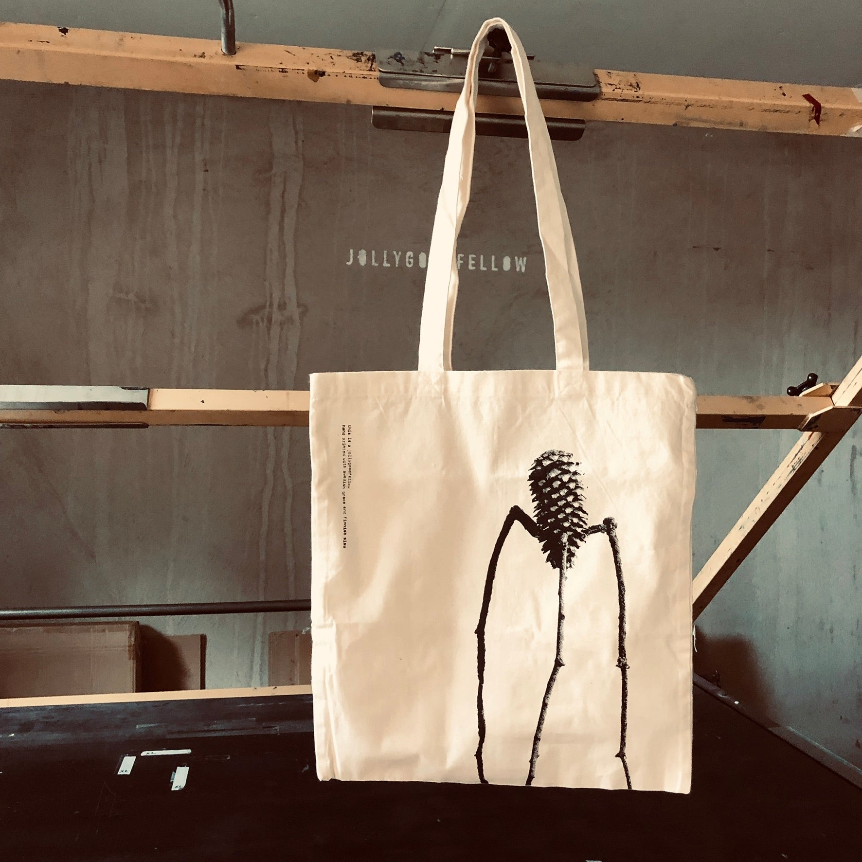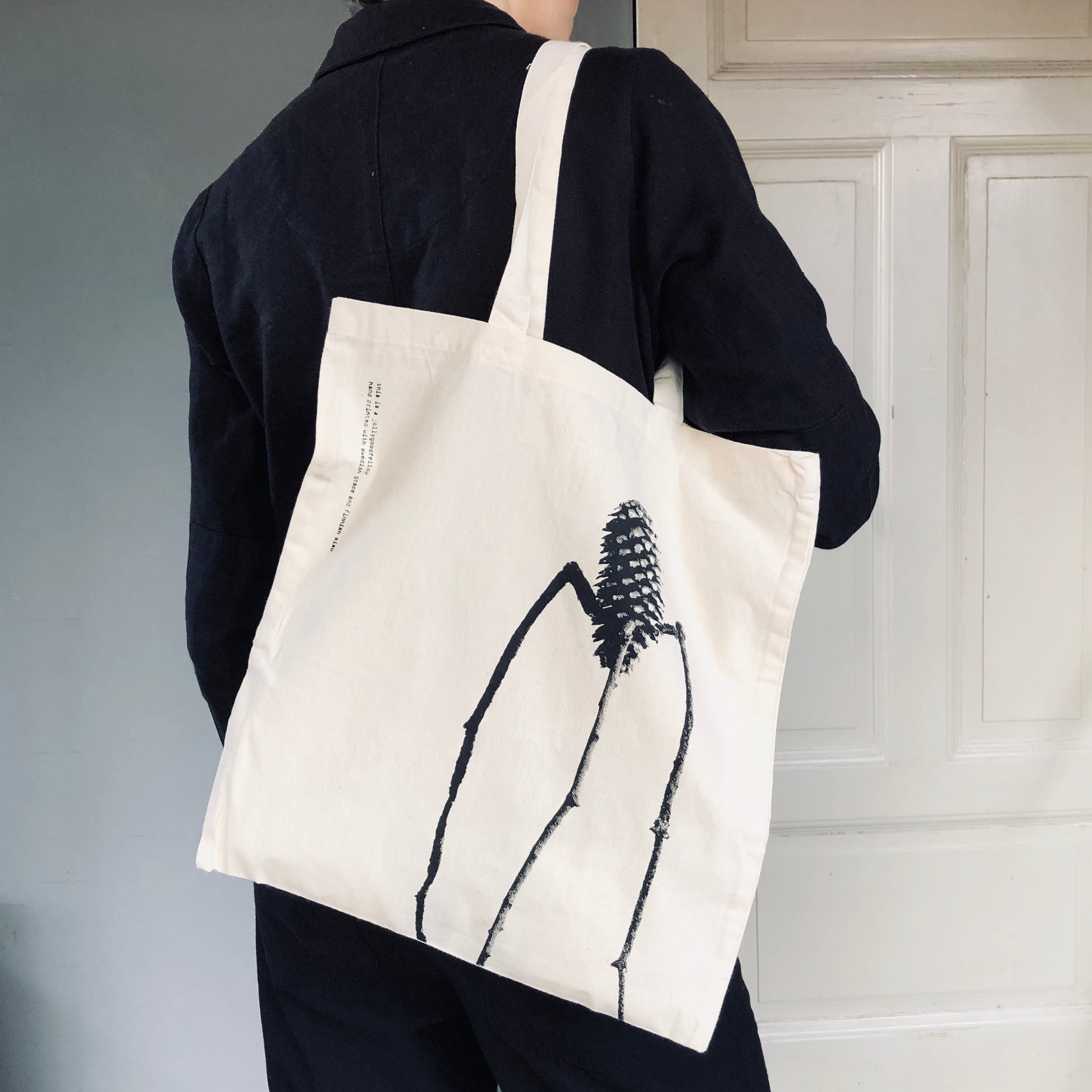 Schwarzer Druck auf einer naturweißen Bio-Tragetasche. Die Farbintensität des Drucks kann leicht variieren, was ein Hinweis darauf ist, dass er von Hand gedruckt wurde!