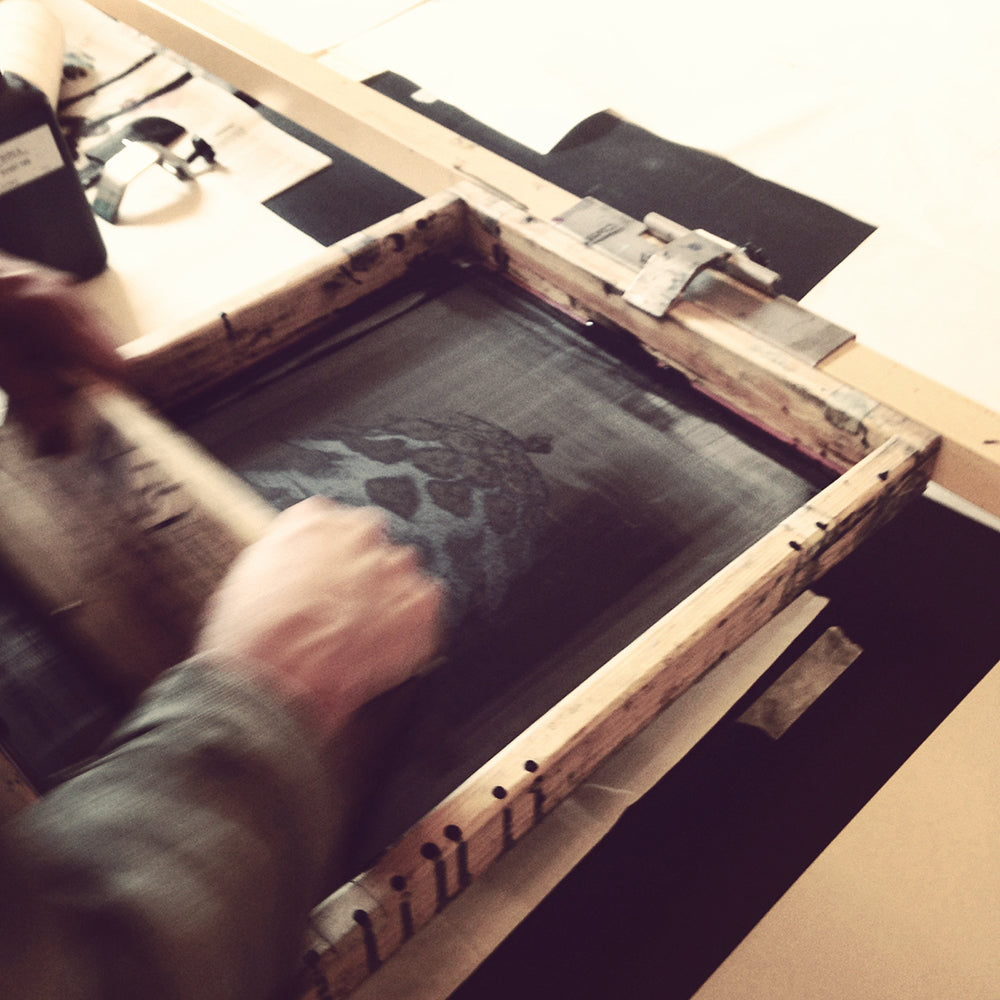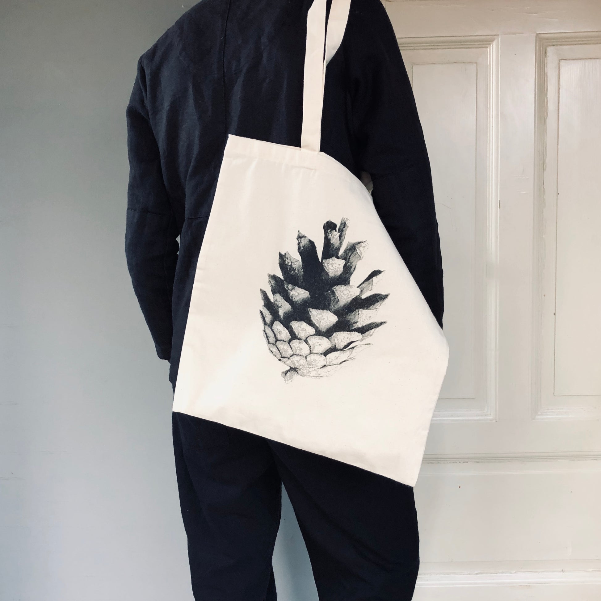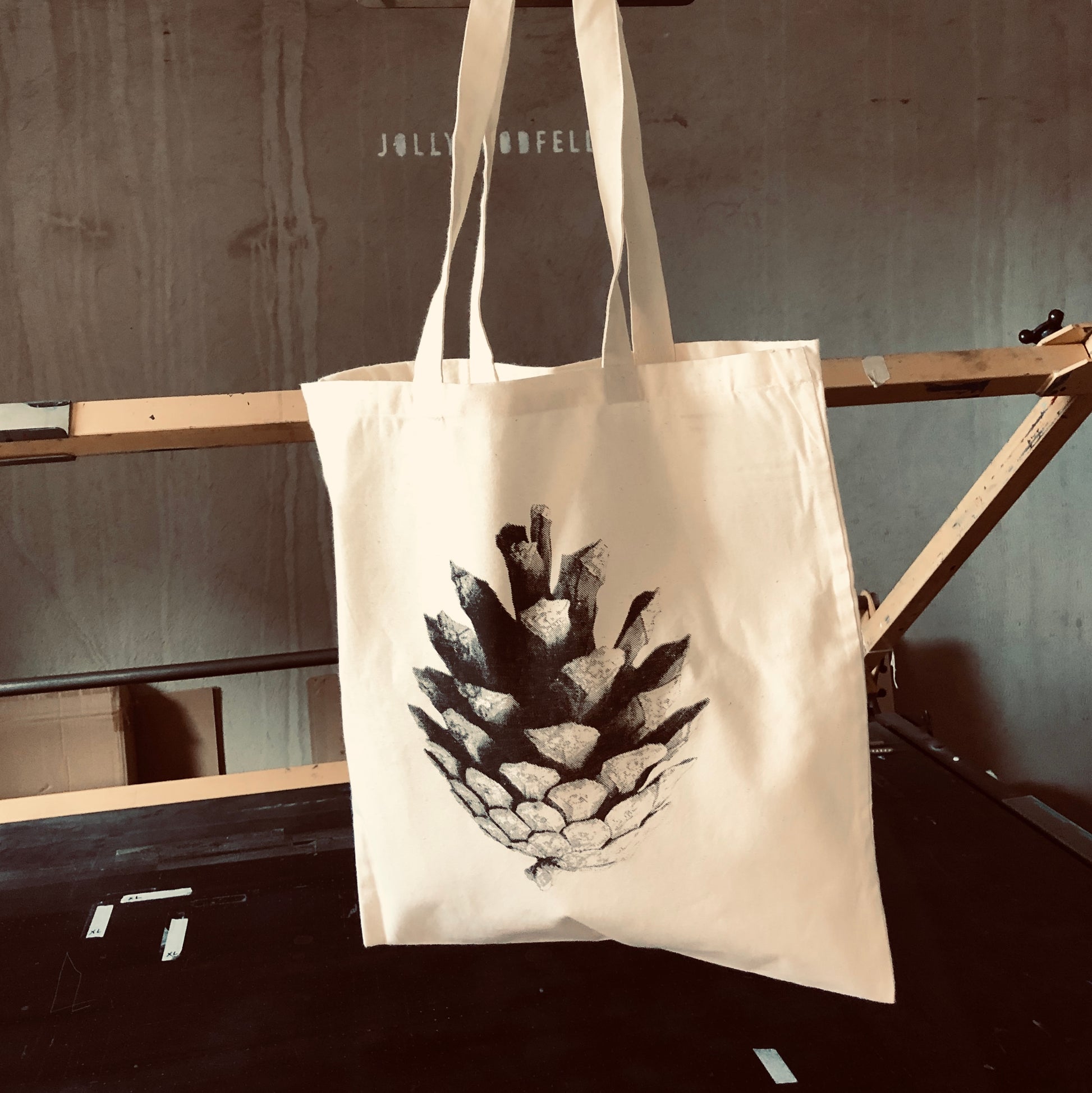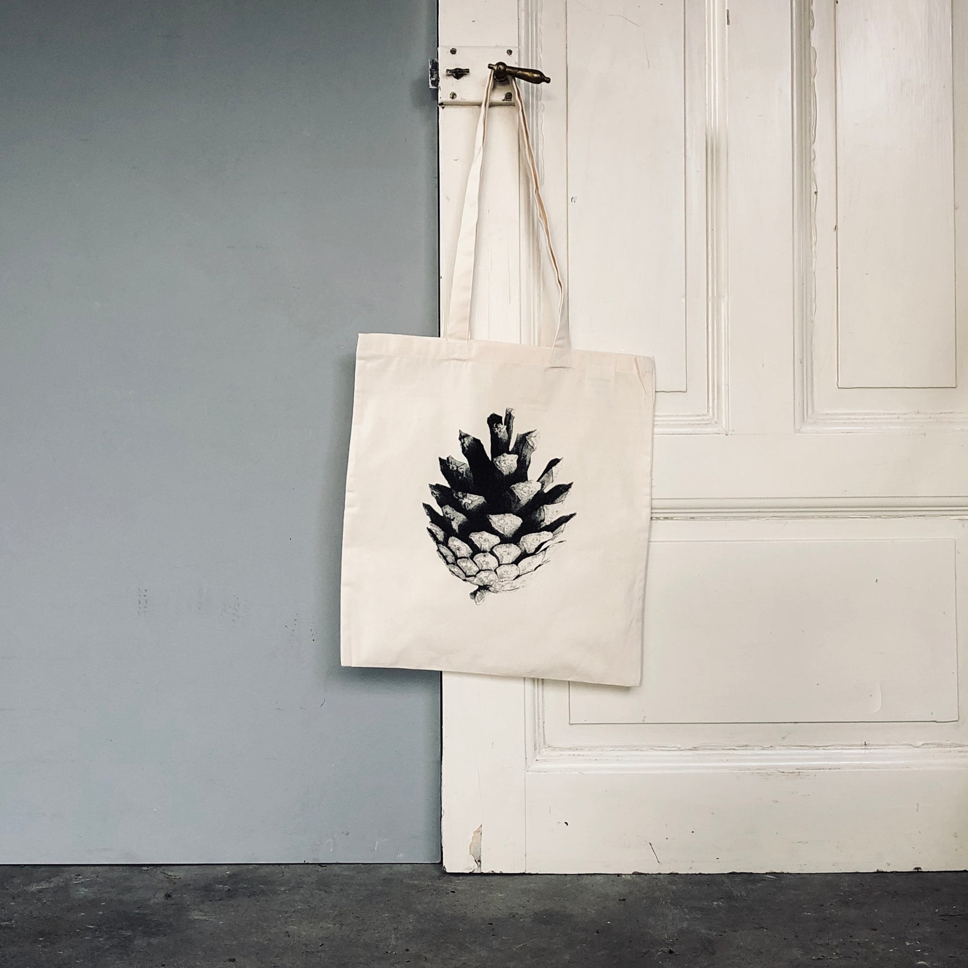 Schwarzer Druck auf einer naturweißen Bio-Tragetasche. Die Farbintensität des Drucks kann leicht variieren, was ein Hinweis darauf ist, dass er von Hand gedruckt wurde!