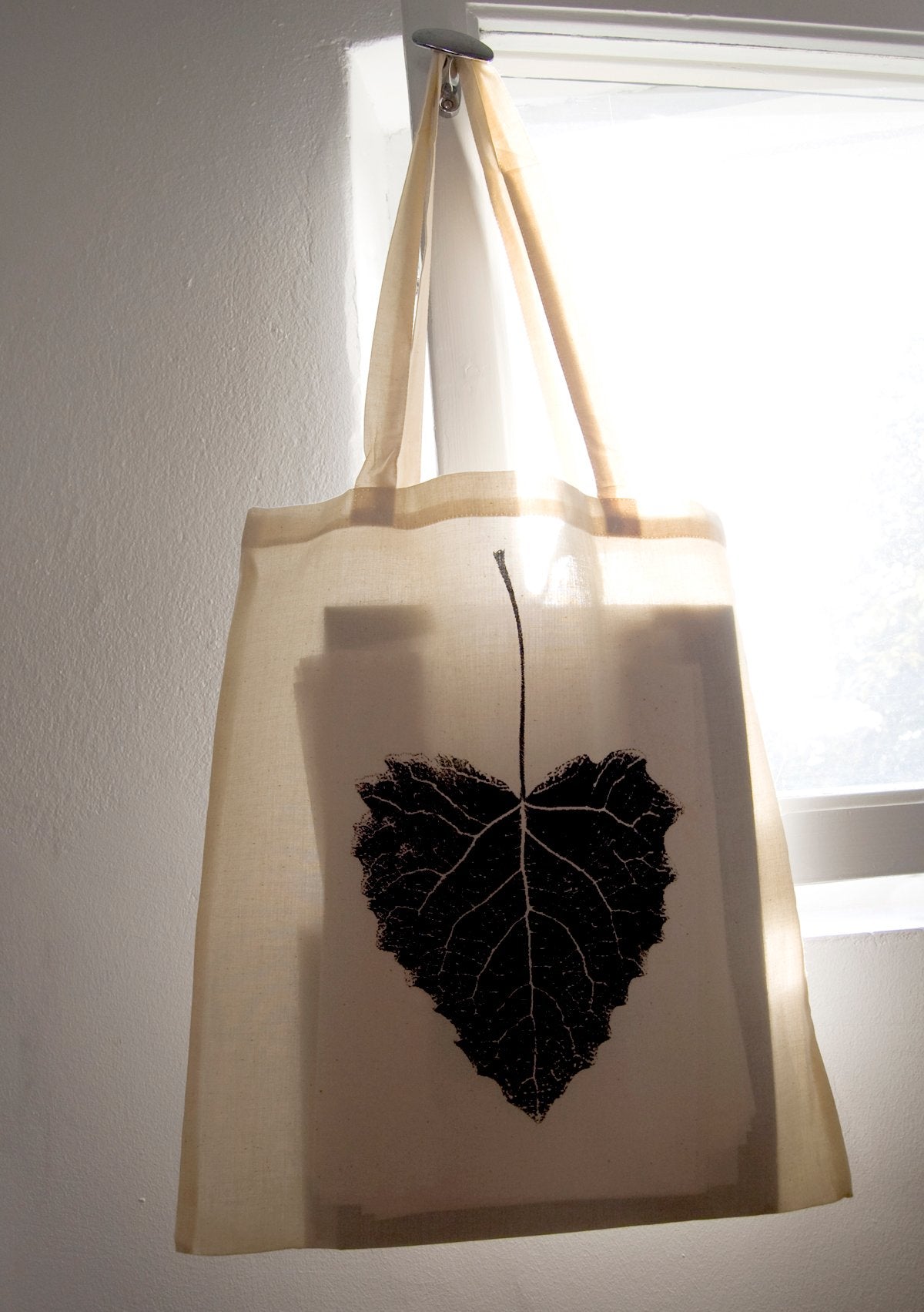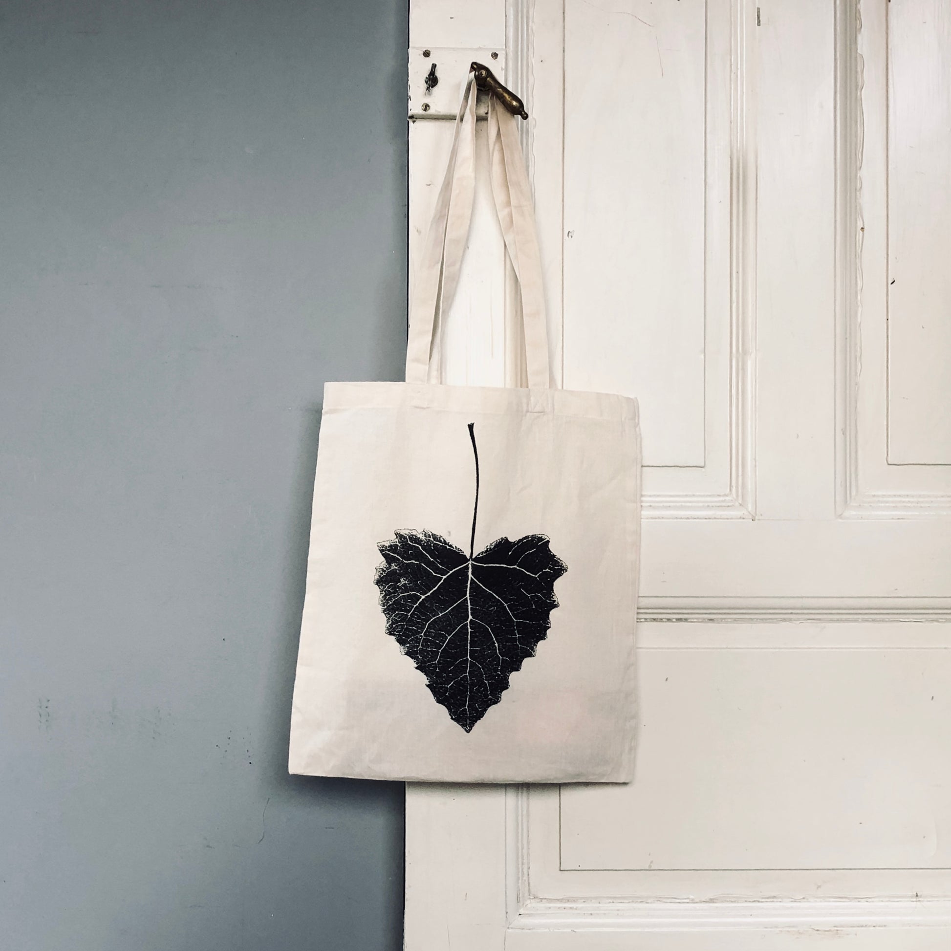 Schwarzer Druck auf einer naturweißen Bio-Tragetasche. Die Farbintensität des Drucks kann leicht variieren, was ein Hinweis darauf ist, dass er von Hand gedruckt wurde!