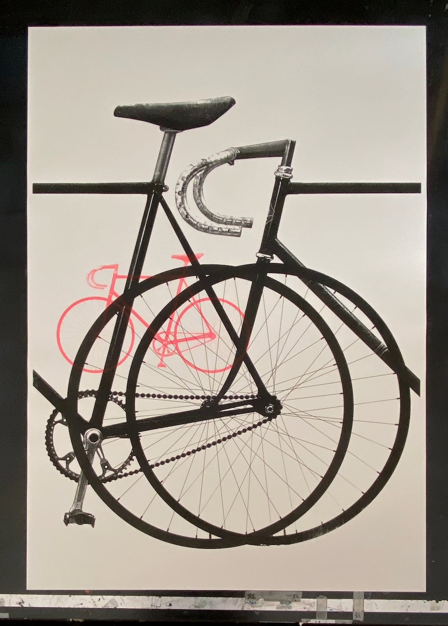 Der vordere Teil unseres Fahrraddrucks Ride XL direkt hinter einem hinteren Teil, als ob es nur zum Überholen reicht. Nummer 159 in der Druckserie waren unsere Upcycling-Testdrucke, wir nennen sie „Unique Fellows“.