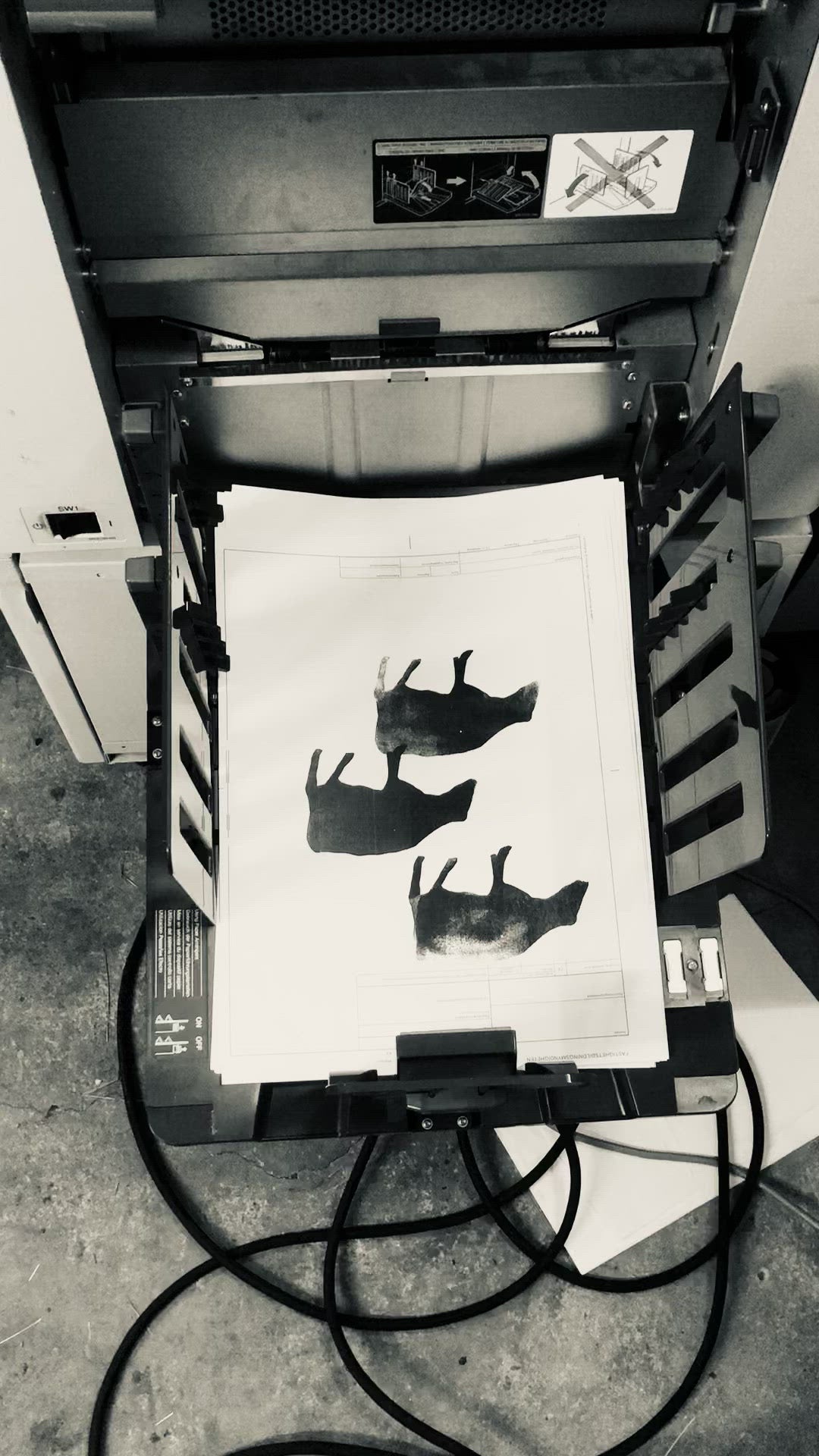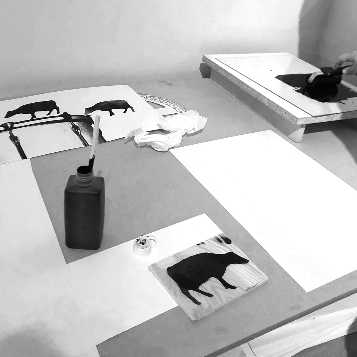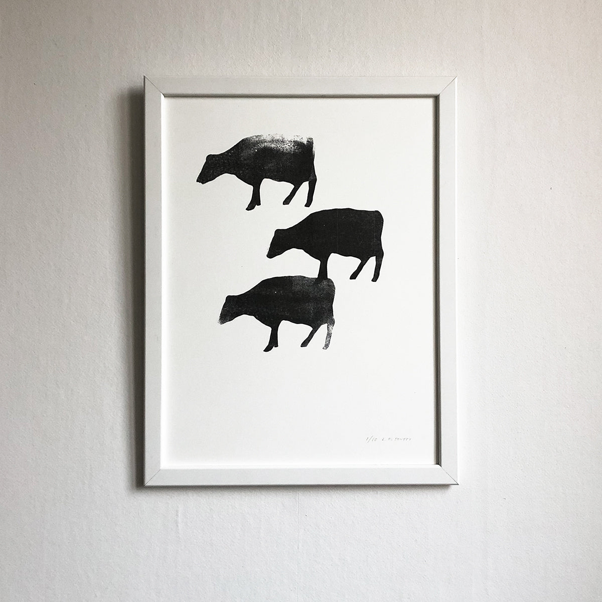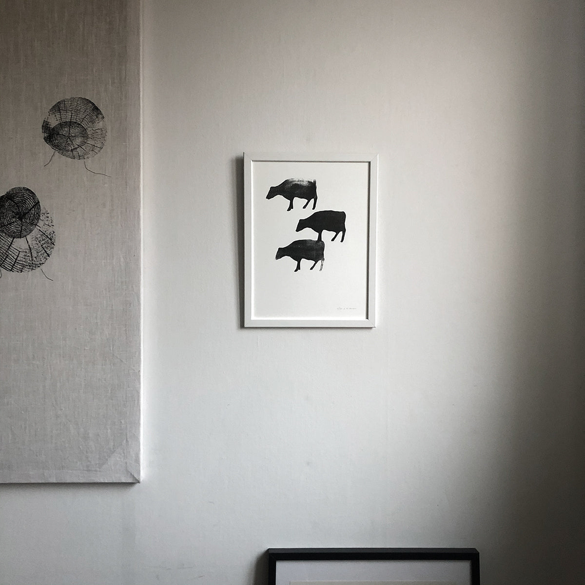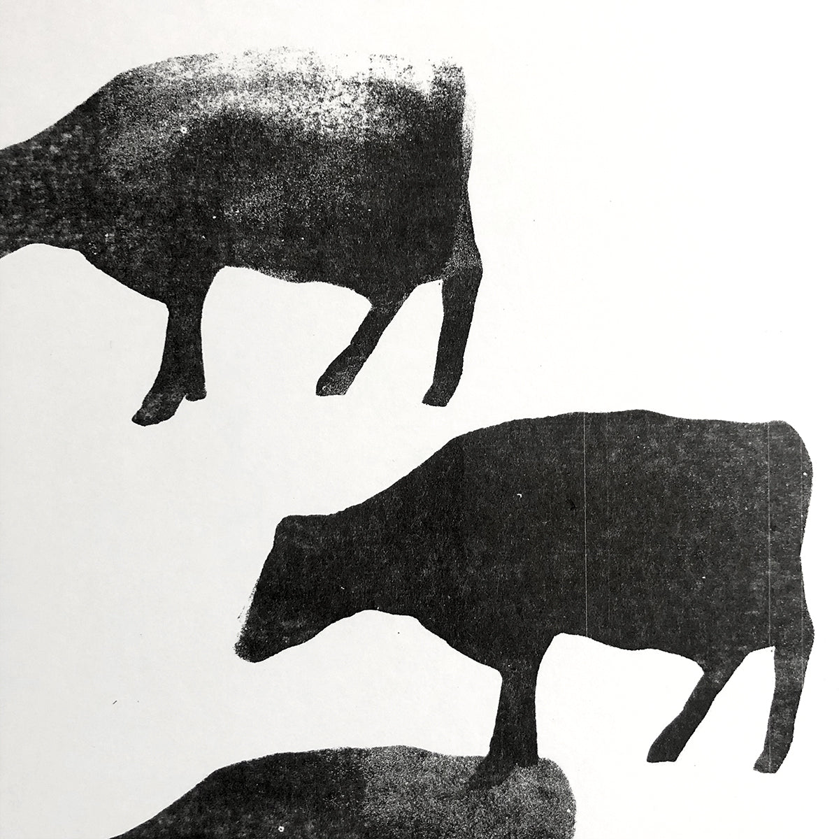 For this print we have combined two printing techniques. First block print – all the cows are stamped with the same block but with different amount of ink. Then we reprinted it with a risograph that we rescued a while ago and now we have started to get to know her : )