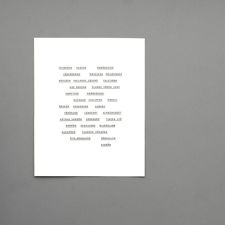 The print "Observationer" (observations) is our tribute to the meditative sound of a slow voice on the radio telling the sea weather.