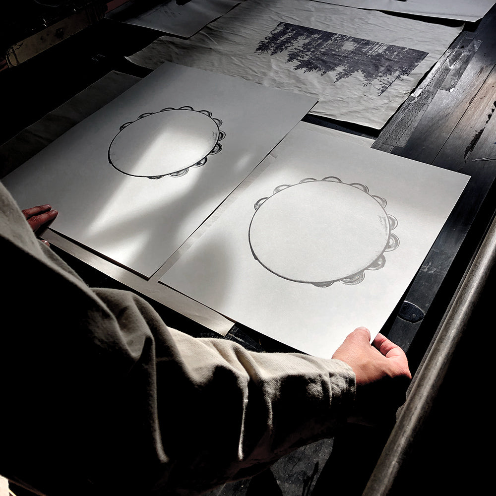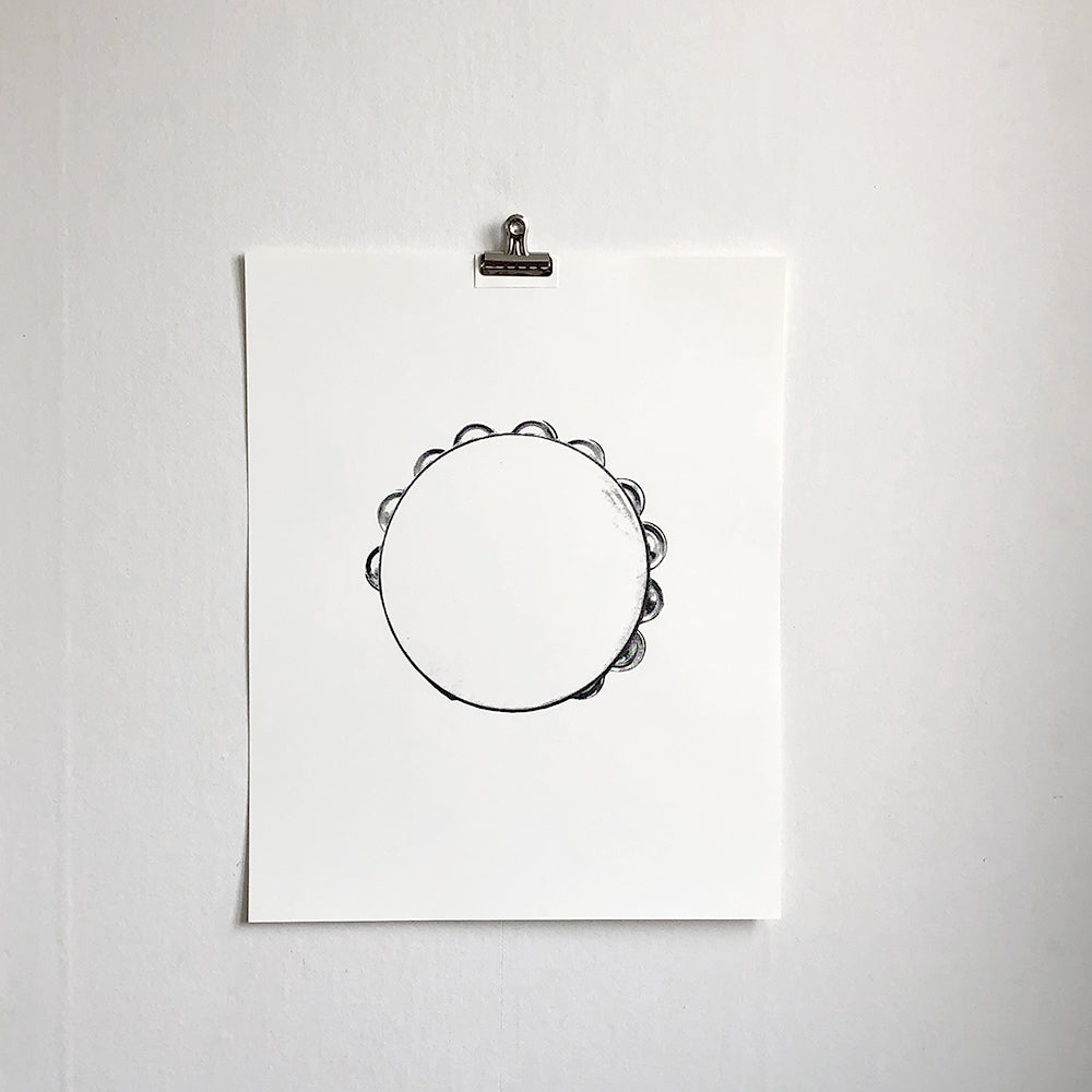 The idea for this print came when we placed a tambourine on the wall as a complement to the prints. Now it's available as a screen print for those of you who don't have the basement full of instruments.